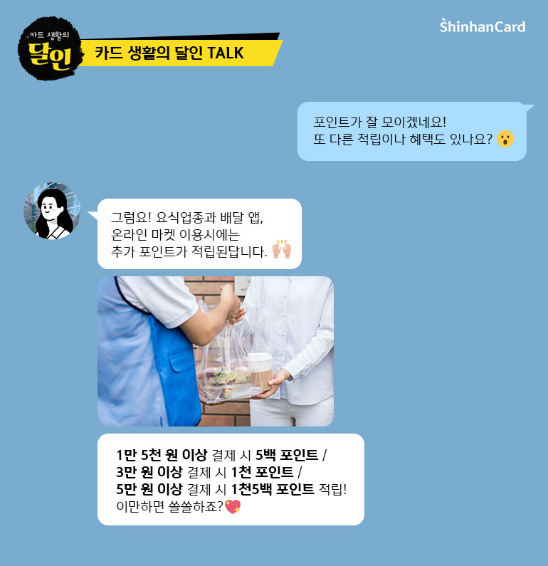 * 콘텐츠의 광고 유효기간이 만료되었습니다. 본 콘텐츠는 신한카드 사료관리의 목적으로만 게재하고 있습니다. 해당 상품/서비스의 이용조건 등 상세사항이 변경되었을 수 있으므로 계약체결 및 이용전 반드시 신한카드 홈페이지의 상품설명서나 약관을 확인하시기 바랍니다.