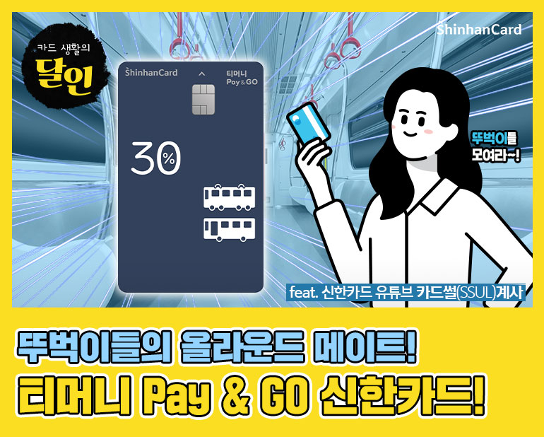 우리 생활 가까이에서 언제나 함께 할 티머니 Pay & GO 신한카드! 뚜벅이력과 생활력이 동시에 만렙이 되는 기적을 느끼며 탈수록 즐겁고 탈수록 득이 되는 일상을 즐겨보세요.