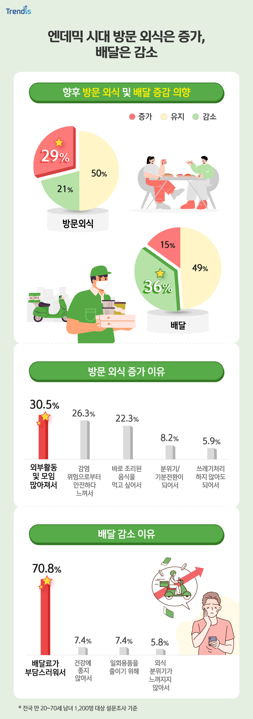 다수의 응답자가 향후 방문 외식은 늘리고 배달 주문은 줄이겠다고 응답했습니다. 방문 외식 증가는 외부활동이나 모임이 많아지고 이전 대비 감염으로부터의 위험을 덜 느껴서인 것 같고요. 배달 주문 감소는 배달료에 대한 부담감이 높아지는 물가로 인해 더 크게 체감됐기 때문인 것 같네요.