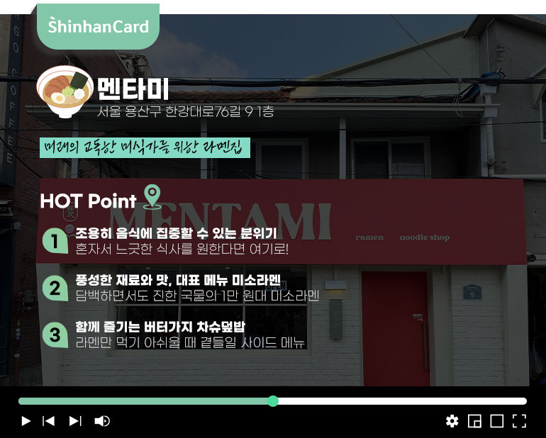 라멘 전문점 <멘타미>는 조용하고 깔끔한 식사를 선호하는 분들이 주로 찾아오는 곳입니다. 혹시 시끌벅적한 분위기보다는 혼자서도 느긋하게 음식에 집중할 수 있는 공간을 찾는다면? 평소보다 어른스러워진 기분을 내고 싶다면? 바로 멘타미를 추천할게요! 서울 한가운데에서 마치 서울 외곽의 고즈넉한 골목길 식당을 온 것 같은 이곳. 그동안 고생했던 속을 아늑한 국물로 달래보아요.