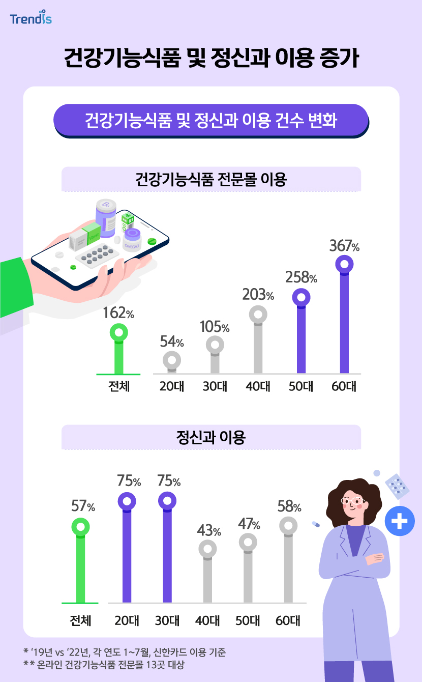 두드러지는 반면, 정신과는 2030세대의 증가율이 좀 더 높았는데요. 요즘 젊은층의 경우 신체적 건강을 넘어 마음 건강에 대한 관심이 높고,