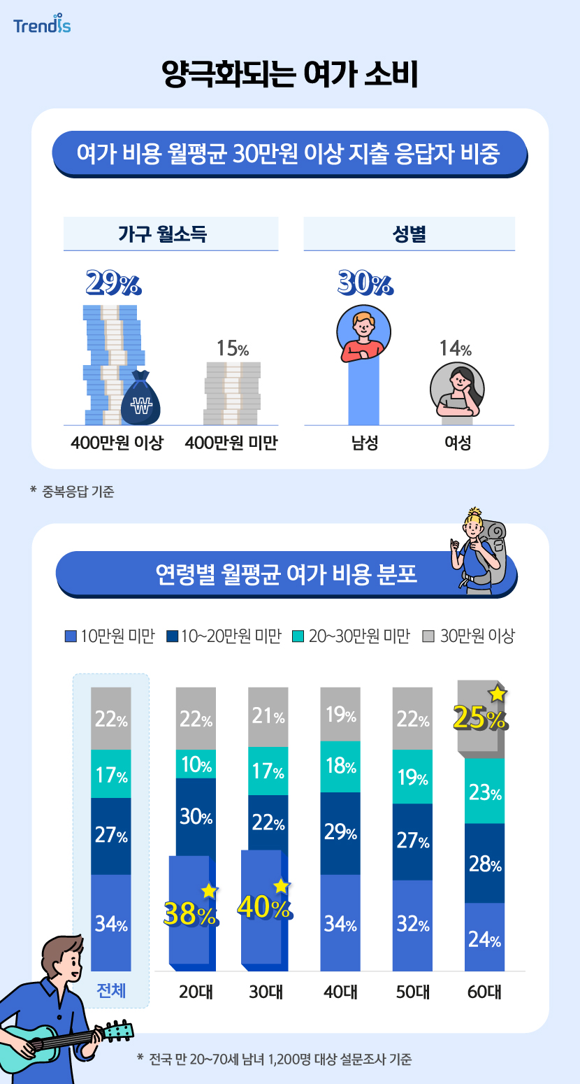 비중이 높아 세대간의 여가 비용 양극화 현상이 나타나고 있음을 확인할 수 있습니다. 젊은층의 경우 소소하게 여가를 즐기는 반면, 고령층의