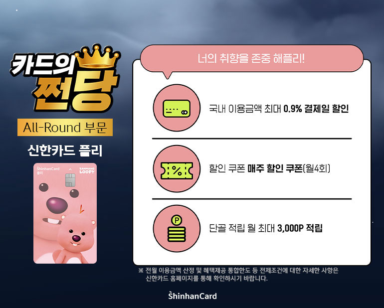 매일매일 즐거운 일상을 선물하는 카드, 신한카드 플리! 데일리-위클리-먼슬리 할인 혜택이 들어가 있다니, 이것은 마치 본 적 없는 혜택의 천국! 신한플레이 앱을 통해 결제하면 조건 없이 매일 0.9% 할인은 기본, 매주마다 3천원 쿠폰 1회 & 1천원 쿠폰 3회가 제공된답니다. 신한카드의 단골 리스트! My Pick 가맹점에서 월 3, 6, 9번째 이용 시 마이신한포인트 1000포인트가 적립되고요! 카드의 전당에서 가장 광범위하면서도 다채로운 할인 프로그램을 지닌 카드 플리. 결제일이 되면 숨 쉬듯 할인된 결제금액을 만날 수 있는 마성의 카드랍니다!
