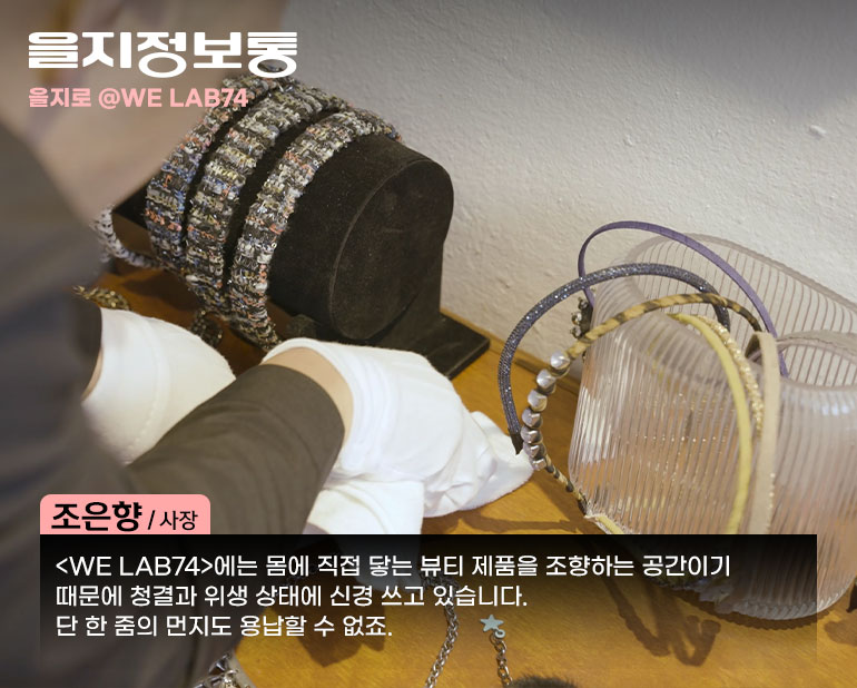 을지로에서만 느낄 수 있는 바이브! 을지로의 클라쓰를 알아보는 세 번째 시간이 돌아왔습니다. 을지정보통 신PD가 간다! 오늘은 추억을 향기로 가득 채우는 공방 <WE LAB74>를 소개합니다. 성큼 다가온 봄, 외출하기 좋은 계절이 돌아오면서 커플뿐만 아니라 친구, 가족들과 함께 할 나들이를 어떤 코스로 계획해야 할까 즐거운 고민이 이어질 텐데요. 그런 날을 대비할 수 있는 이곳, 요즘 사랑받는 감성 그 자체인 향수 공방 <WE LAB74>에 다녀왔습니다. 같이 보실까요?