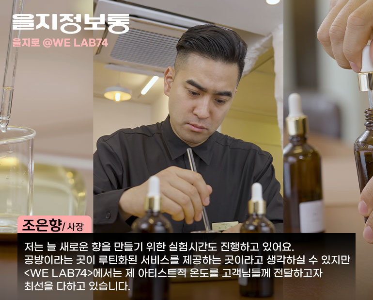 을지로에서만 느낄 수 있는 바이브! 을지로의 클라쓰를 알아보는 세 번째 시간이 돌아왔습니다. 을지정보통 신PD가 간다! 오늘은 추억을 향기로 가득 채우는 공방 <WE LAB74>를 소개합니다. 성큼 다가온 봄, 외출하기 좋은 계절이 돌아오면서 커플뿐만 아니라 친구, 가족들과 함께 할 나들이를 어떤 코스로 계획해야 할까 즐거운 고민이 이어질 텐데요. 그런 날을 대비할 수 있는 이곳, 요즘 사랑받는 감성 그 자체인 향수 공방 <WE LAB74>에 다녀왔습니다. 같이 보실까요?