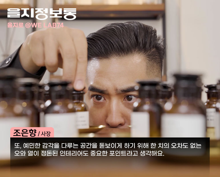 <WE LAB74>는 을지로 건물 옥상에 위치해 있어 넓은 테라스까지 보유하고 있는 공간입니다. 조향을 위해 태어난 사람인 조은향 사장님의 섬세한 감성과 인테리어까지 엿볼 수 있는 감성 넘치는 향수 공방인데요. 나만의 향수 만들기 같은 원데이 클래스뿐만 아니라 루프탑 대관도 진행하고 있어 파티나 촬영 스냅처럼 특별한 추억을 기록할 수도 있습니다. 좋은 향으로 가득한 공간 <WE LAB74>의 조은향 사장님과 저 신PD와 함께 향기의 매력에 빠져봅시다.