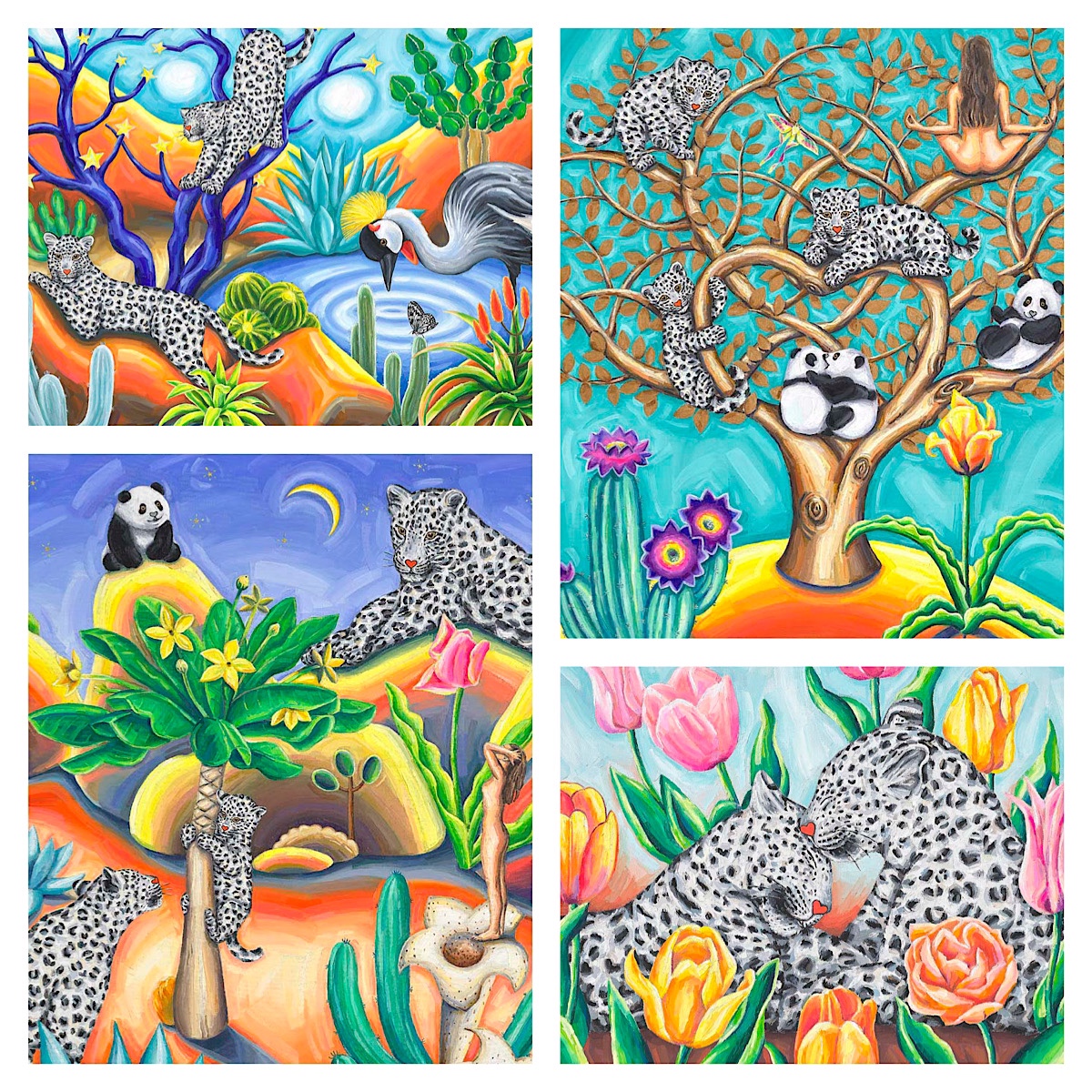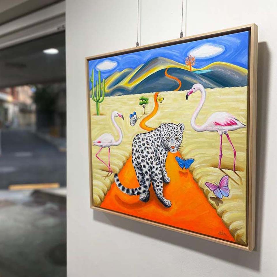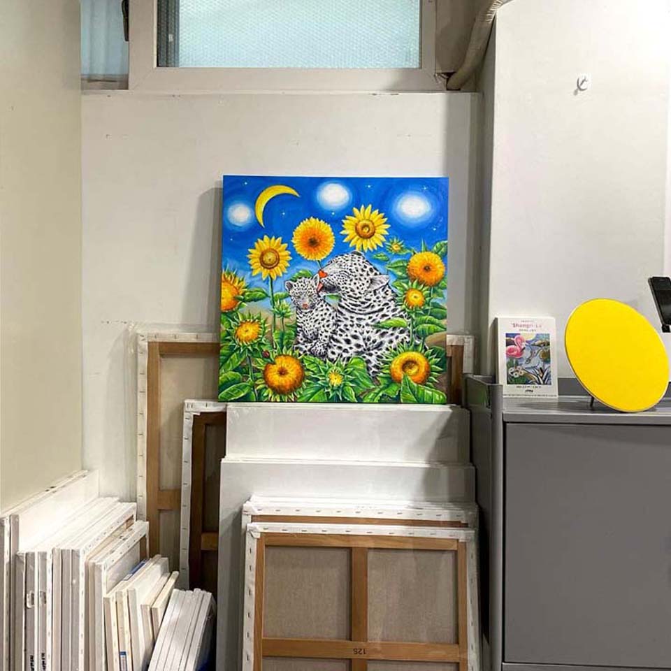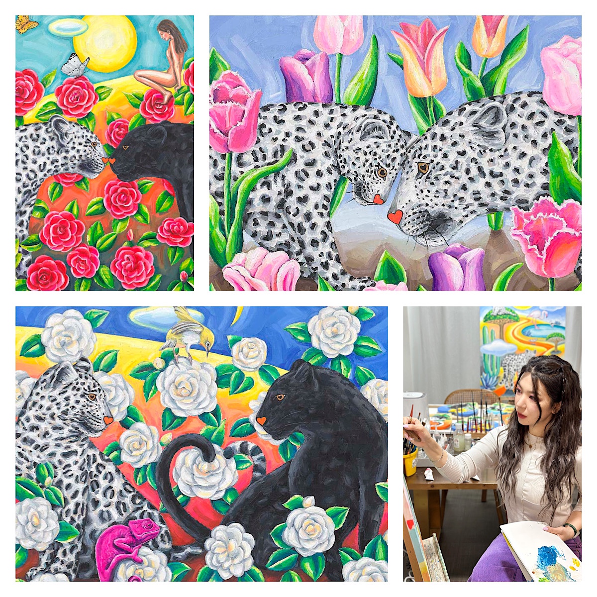 안녕하세요. ‘파라다이스의 여행자’ 아이라최 작가입니다. 2013년에 데뷔해 올해로 11년째 그림을 그리고 있고요, 주로 낙원과 대자연, 달빛 파라다이스 등을 주제로 작업하고 있어요. 파라다이스에는 그림의 주인공이자 낙원의 수호자인 흰 표범과 여행자인 인간을 포함해 상징성을 가진 다양한 동식물이 살고 있어요. 이곳에는 시공간과 생사의 경계가 없고 선과 악도 없어서 영원한 사랑과 행복이 존재한답니다. 작품에는 오일을 쓰지 않고 순수한 물감을 나이프로 떠서 고채도의 다양한 컬러를 표현해요.