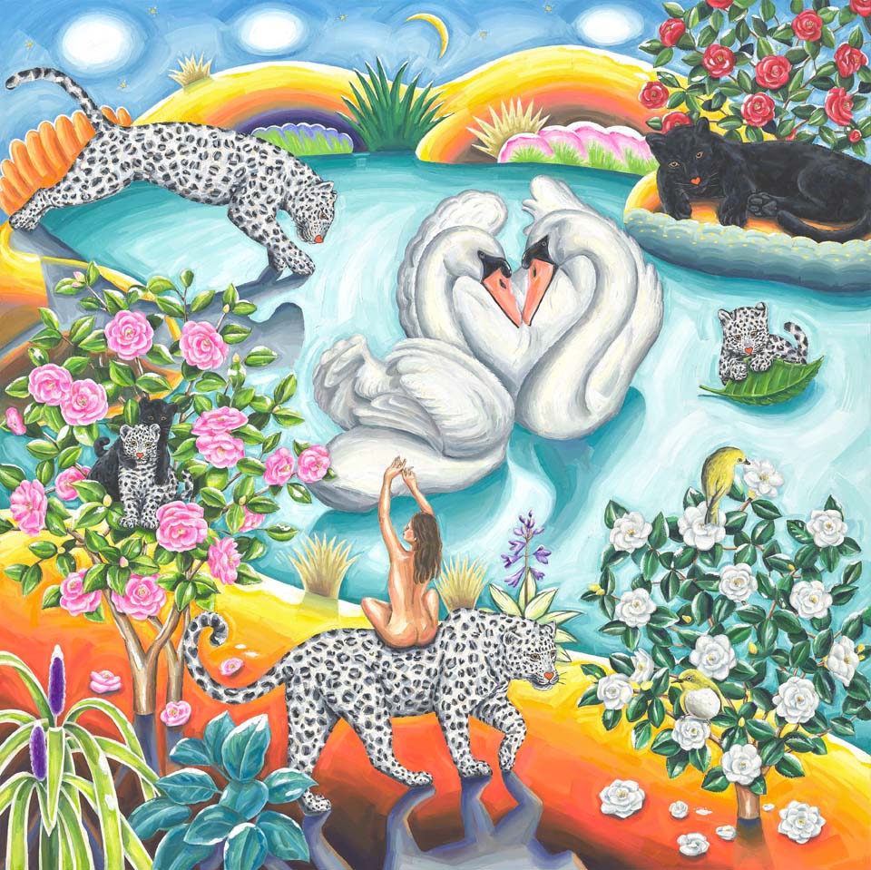 작품의 스토리는 파라다이스를 향한 여정과 같아요. 제 작품에는 인간을 대변하는 작은 여인이 등장하는데요, 이 여인이 낙원을 여행하며 만나는 동물, 식물들, 그리고 배경을 상상해서 그림을 그려요. 뜨거운 사막과 깎아지르는 바위산을 오르고, 바다와 강물을 건너고, 또 때로는 꽃놀이를 하거나 호숫가에 앉아 쉬어가기도 하죠.