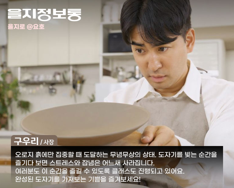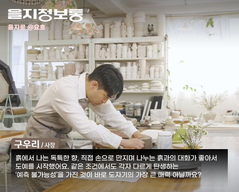 우리가 알아야 할 을지로는 아직도 많이 남아 있습니다. 점점 더워지는 요즘, 실내에서 보낼 수 있는 색다른 무엇을 원하게 되죠. 매일 가는 카페나 밥집, 영화관 말고 특별한 순간을 보내고 싶은 분들을 위해 준비한 ‘을지정보통’의 다섯 번째 주인공은 바로 도예공방 <요호>입니다. 내 힘으로 무언가를 만드는 경험은 나 자신을 새롭게 만나 보는 뿌듯함이 됩니다. 손으로 나누는 흙과의 대화 시간, 도예공방 <요호>를 소개합니다.