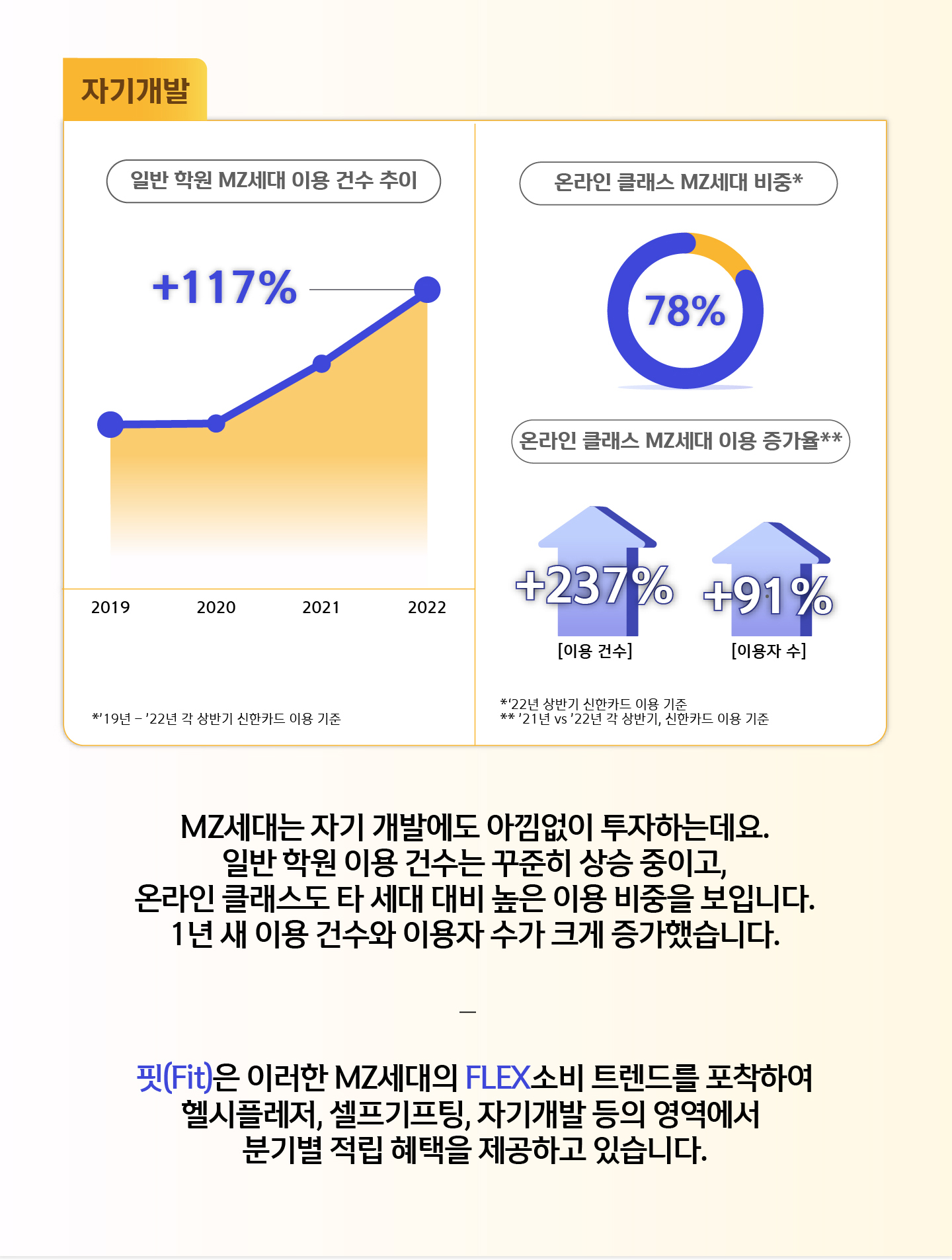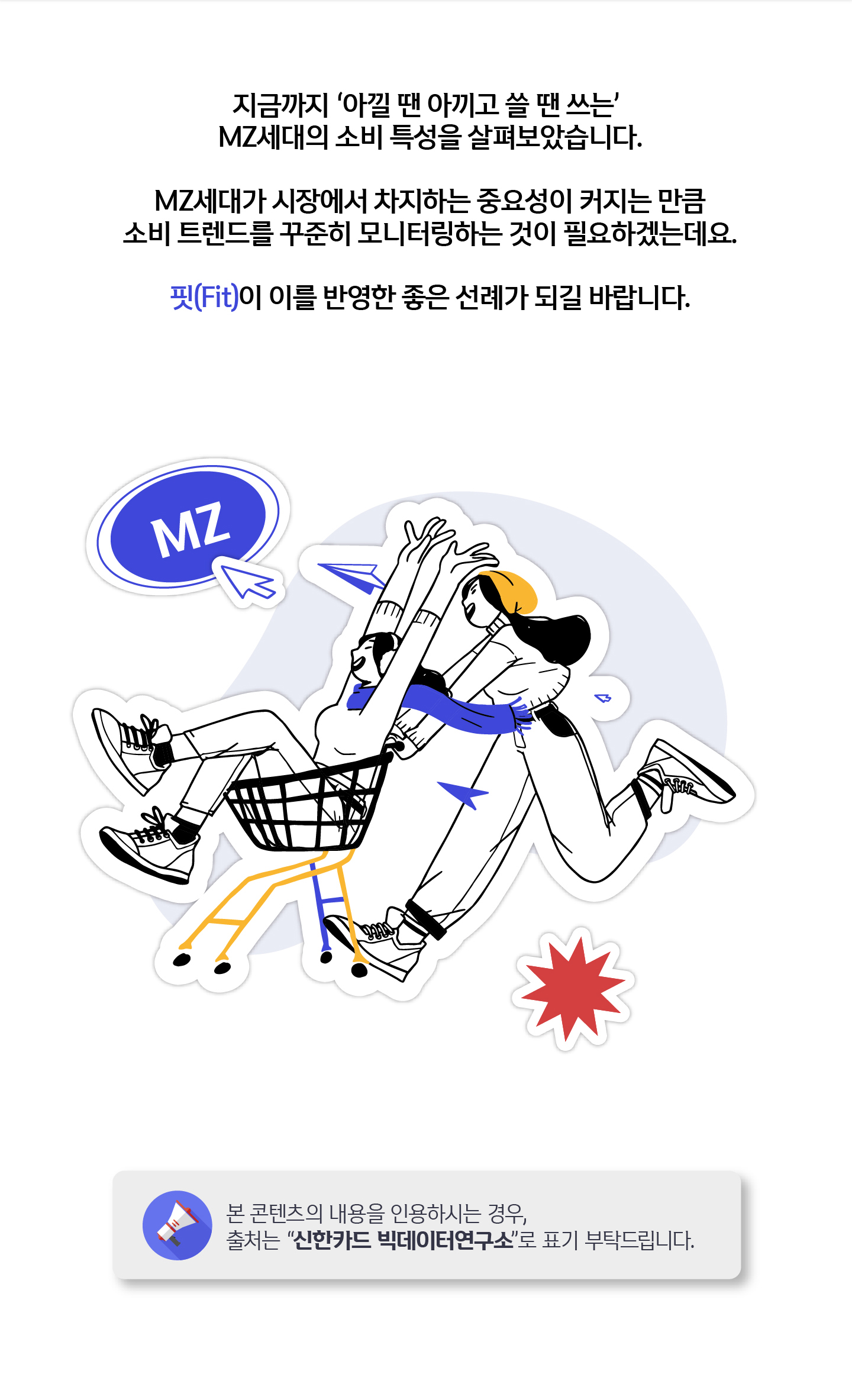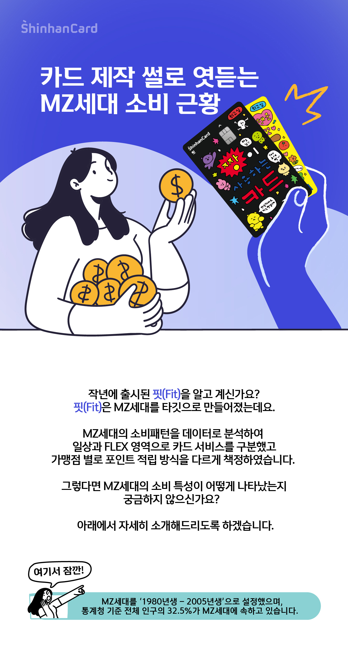 지난해 MZ세대를 타깃으로 출시된 핏(Fit)을 알고 계신가요? 핏(Fit)은 MZ세대의 소비패턴을 데이터로 분석하여 만들어진 카드인데요. 어떠한 MZ세대의 소비 특성들이 카드에 반영되었을지 아래에서 자세히 알아봅시다!