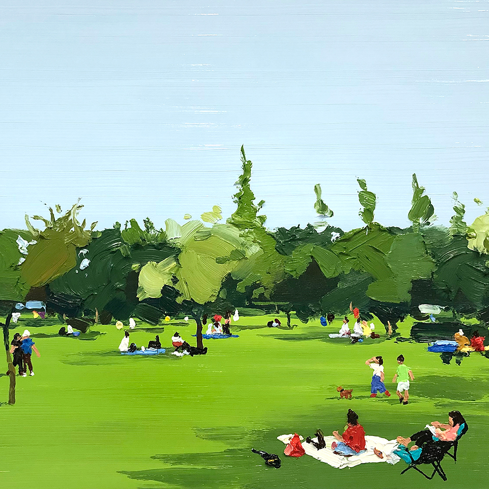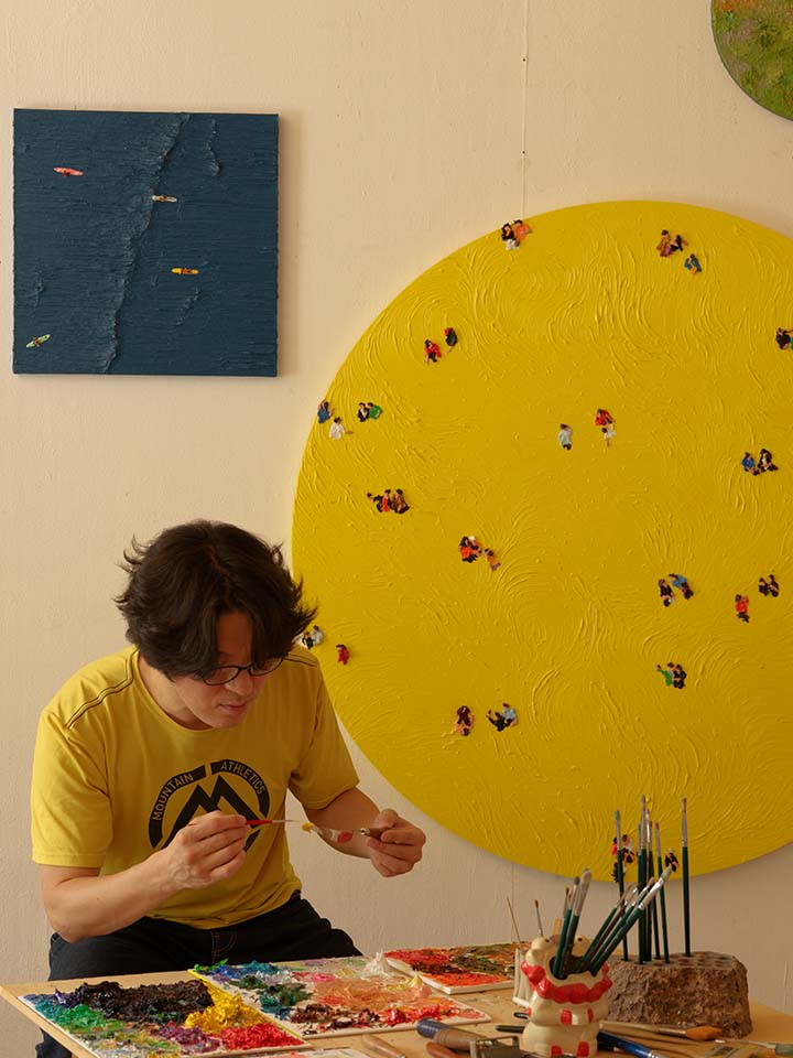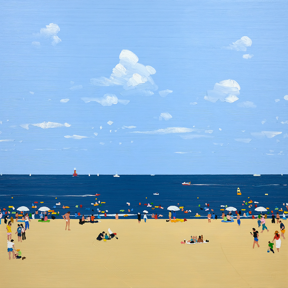 해변가에서 물놀이를 즐기는 사람들, 공원에서 여유로운 한때를 보내는 이들…이상원 작가는 곳곳에서 휴식을 즐기고 있는 군중의 모습을 캔버스에 담는다. 유화로 그려낸 형형색색의 군중 사이 어쩐지 나의 모습이 있을 것 같기도 하고, 작품을 멀리서 바라보고 있으면 그림 전체가 어떤 패턴인 것처럼 느껴지기도 한다. 리얼 아트 버라이어티 No Money No Art 6회차 우승자 이상원 작가를 만나 그의 작품 세계를 물었다.