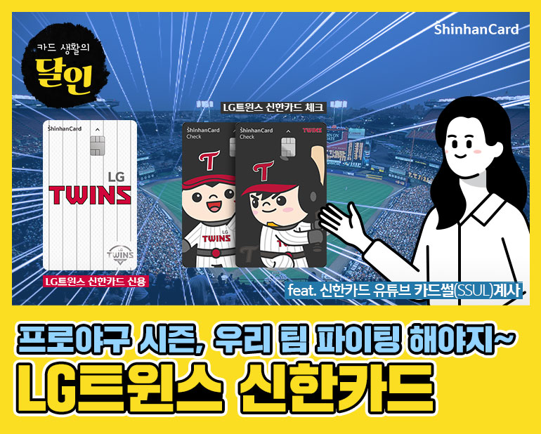 프로 야구의 열기는 이제 막 시작된 여름처럼 뜨거운 열기를 더하고 있는데요. 그 중심에 LG 트윈스가 있다는 사실이 팬들을 가슴 뛰게 만들고 있습니다. 주변에 아직 야구의 매력을 모르는 분들이 있다면, 경기만큼 기대되는 혜택이 가득한 LG트윈스 신한카드와 함께 이참에 LG트윈스의 팬으로 영업해 보는 것은 어떨까요? 함께 즐길수록 더 짜릿한 야구! 신한카드가 여러분들의 스포츠 덕심도 서포트하겠습니다!