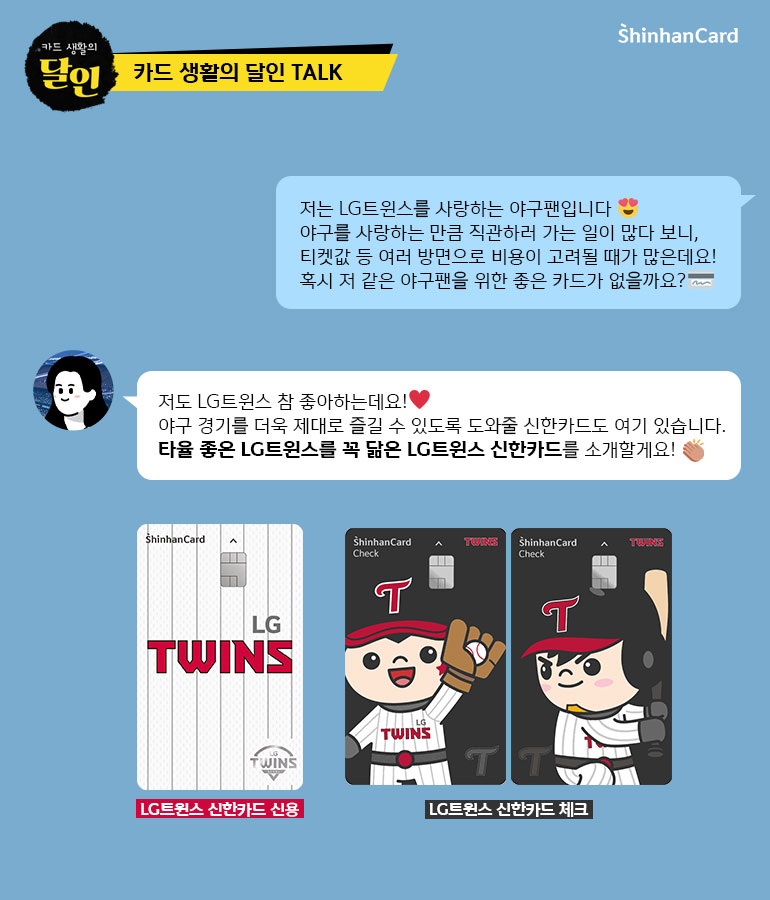 프로 야구의 열기는 이제 막 시작된 여름처럼 뜨거운 열기를 더하고 있는데요. 그 중심에 LG 트윈스가 있다는 사실이 팬들을 가슴 뛰게 만들고 있습니다. 주변에 아직 야구의 매력을 모르는 분들이 있다면, 경기만큼 기대되는 혜택이 가득한 LG트윈스 신한카드와 함께 이참에 LG트윈스의 팬으로 영업해 보는 것은 어떨까요? 함께 즐길수록 더 짜릿한 야구! 신한카드가 여러분들의 스포츠 덕심도 서포트하겠습니다!