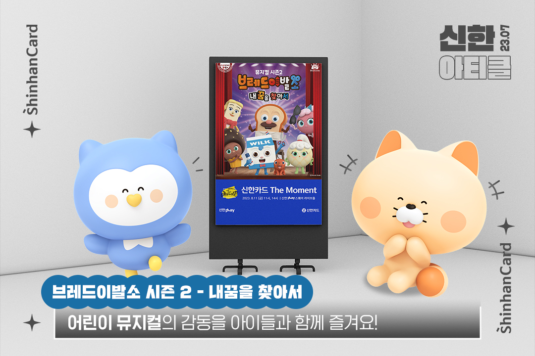 어린 자녀들을 둔 부모님이라면 또 주목할 만한 혜택! 귀여운 윌크와 시크한 초코, 매력적인 사장님 브레드를 눈앞에서 직접 만나볼 수 있는 이번 뮤지컬을 신한카드와 함께 관람해보세요. 8월 11일 금요일 오전 11시, 오후 2시 공연을 신한카드 결제 시 55% 할인된 가격에 구매할 수 있습니다. 또 하나 The Moment 공연에서만 만날 수 있는 럭키드로우 이벤트까지!