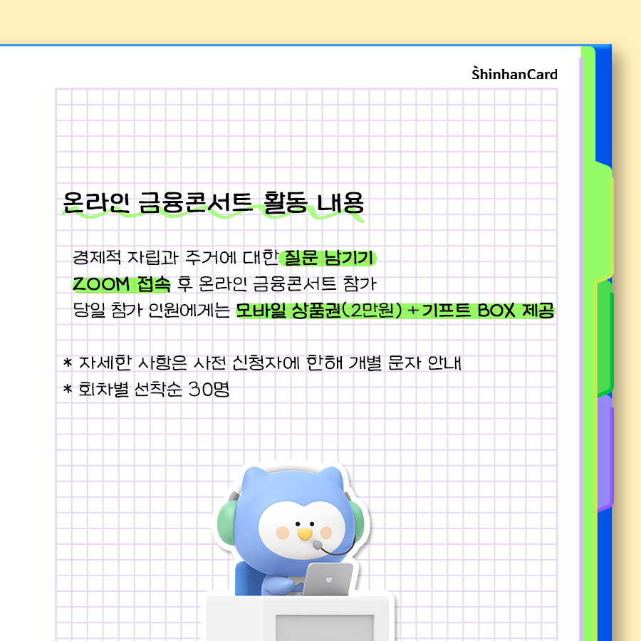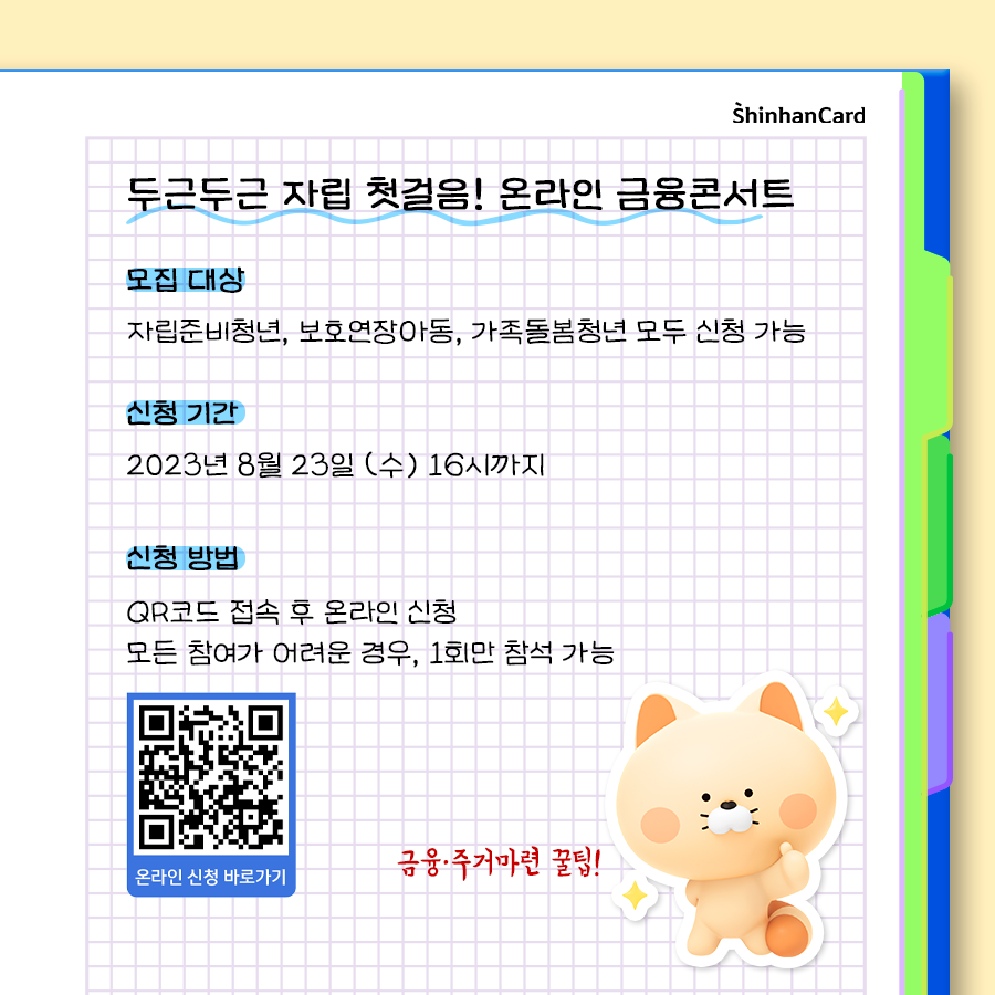 신한카드는 다가오는 9월 자립준비 청년, 보호 연장아동, 가족 돌봄 청년 등 디지털 취약계층의 경제적 자립을 위한 온라인 금융콘서트를 개최합니다. 자립 준비를 어떻게 무엇부터 시작해야 할지 막막하다면 각 분야 (금융 편 / 주거 편)의 전문가와 함께 자립 준비 노하우를 위한 온라인 토크 콘서트에 참여해 보세요. 회차별 선착순 30명 인원이 참여 가능하고 당일 참가 인원에게는 모바일 상품권 (2만원) 과 추가 기프트 BOX도 제공된다고 하니 경제적 자립을 위한 철저한 준비, 온라인 금융콘서트와 함께 시작해보면 어떨까요?