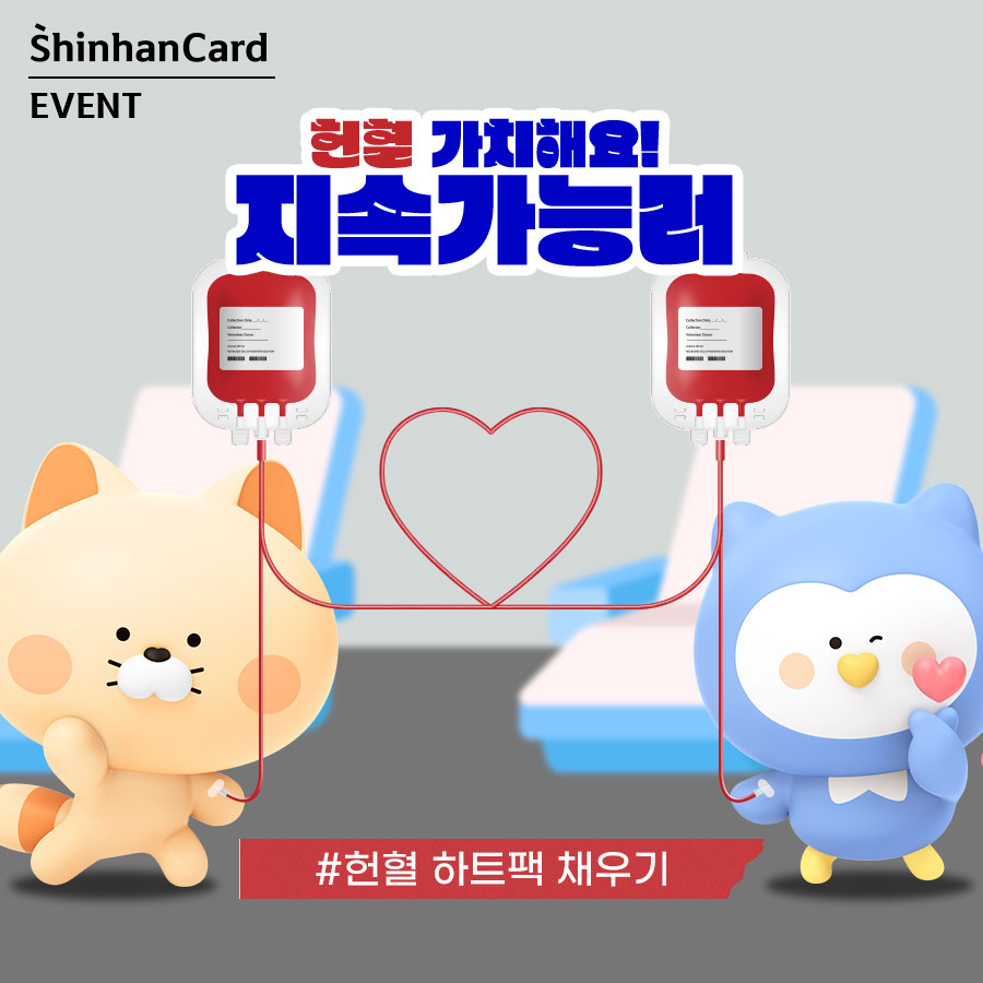 신한카드는 매월 마음을 더하며 함께 참여할 수 있는 이벤트를 진행하고 있는데요. 지난 6월 친환경 무라벨 제품 사용 독려 이벤트와 7월 일회용품 재사용 꿀팁 공유 이벤트에 이어 8월에는 팬데믹 이후 매년 지속적으로 감소하고 있는 혈액 수급 문제 해결을 위한 헌혈 하트팩 채우기 이벤트를 진행합니다. 수혈이 필요한 환자의 생명을 구하는 유일한 수단인 혈액! 혈액 수급 안정화와 건강한 헌혈 참여 문화 확대를 위해 기획한 이벤트인데요. 이번 달에는 하트를 꾸~욱 눌러 마음을 더하는 것으로 이벤트에 동참할 수 있습니다. 지금 당장 헌혈을 하지 않더라도 혈액 수급 문제를 인식하고 헌혈의 필요성을 아는 것만으로도 지속가능한 미래를 위한 건강한 헌혈문화의 정착에 도움이 될 것이라 믿기 때문인데요. 우리 모두를 위한 사랑의 실천! 여러분이 그 시작의 주인공입니다. 언제든 기회가 되신다면 건강한 헌혈에 동참해주세요!