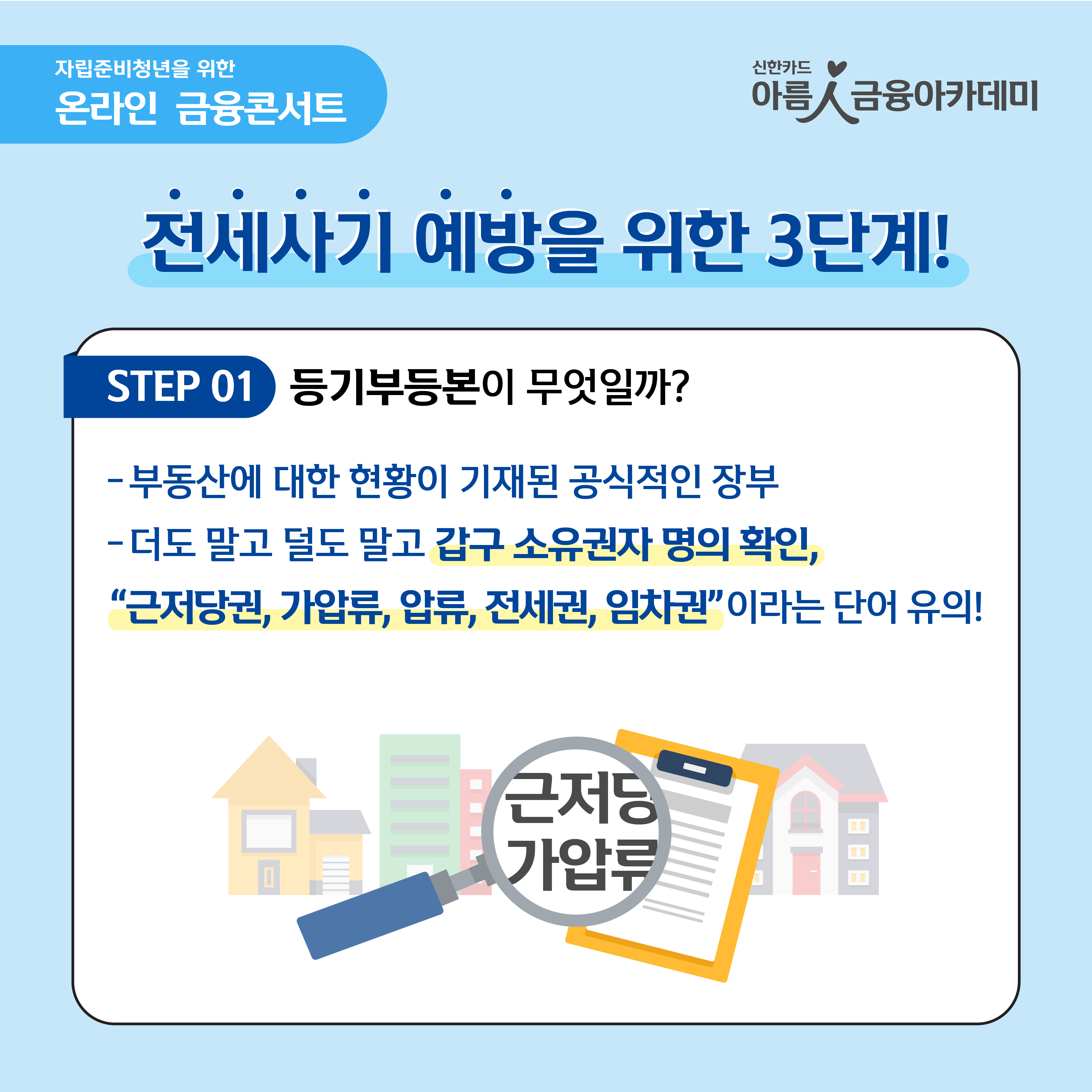 지난 5월에 진행된 온라인 금융콘서트의 알찬 정보를 다시 한 번 전하기 위해 2탄으로 돌아왔습니다! 온라인 금융콘서트 두 번째 시간은 금융전문가 고준석 대표와 함께했는데요. 최근 사회적인 문제로 떠오르고 있는 전세 사기 문제를 미리 예방하고 대처할 수 있는 방법과 전세사기 예방 Q&A 등을 자세히 알아보는 시간이었습니다.
