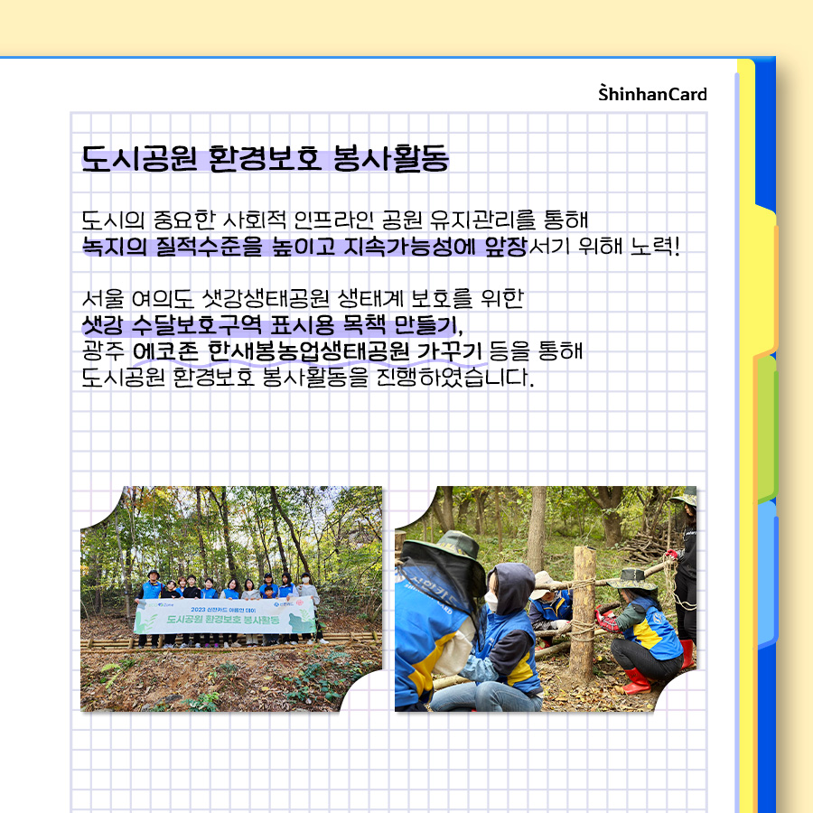 신한카드의 선한 영향력! 11월의 ‘지속가능 신한’ 소식!2023년도 어느덧 막바지를 향해 달려가고 있습니다. 올해부터 신한카드는 매월 ESG 확산 캠페인 일환으로 ‘지속가능 신한’ 시리즈를 다양한 ESG 활동 소식과 함께 고객 참여형 이벤트로 진행하고 있는데요. 11월에는 신한카드 임직원들이 창립기념 아름인데이에 진행한 봉사활동 소식과 업사이클링 실천 브랜드 추천 이벤트 소식을 들고 찾아왔습니다. 그럼 11월 지속가능 신한 소식 자세히 살펴봅시다.
