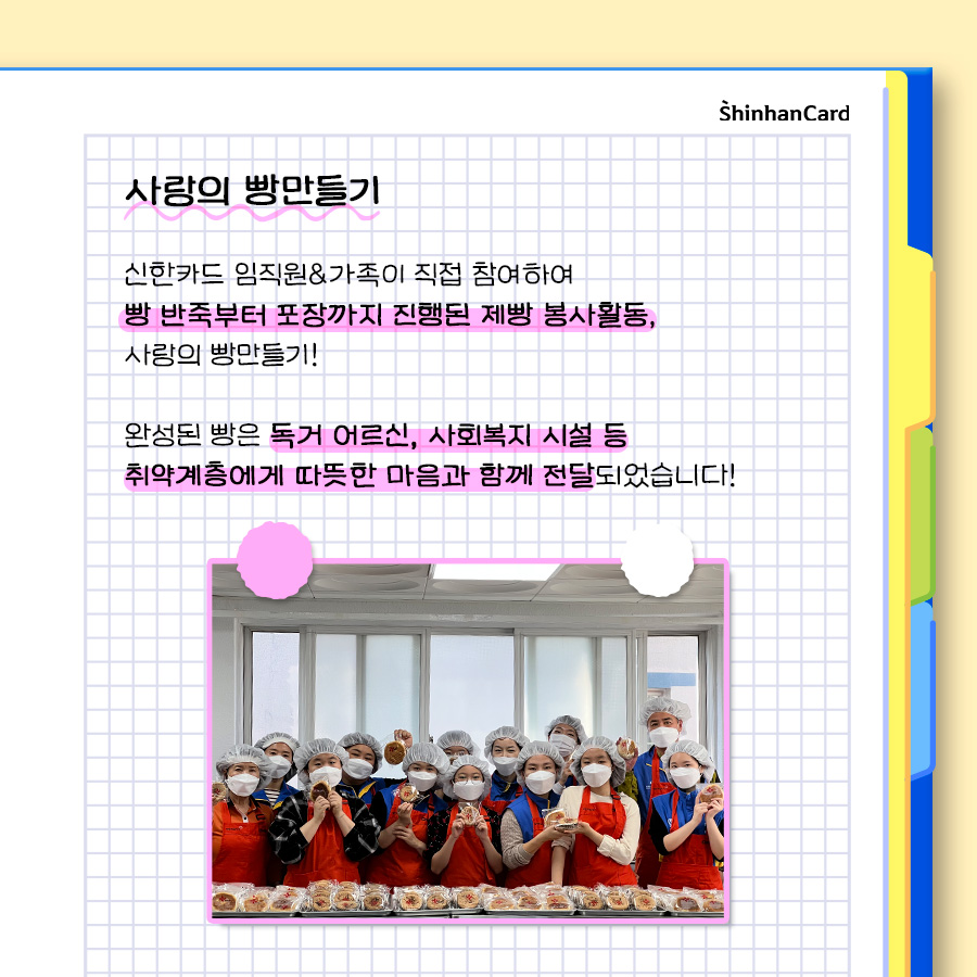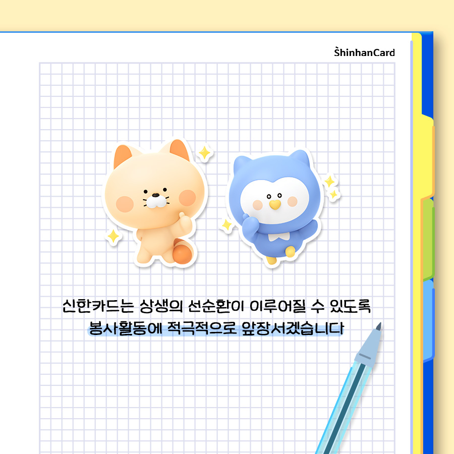 앞으로도 신한카드는 우리 사회구성원으로서 기업의 사회적인 책임을 느끼며 꾸준한 나눔과 봉사활동을 통해 상생의 선순환에 앞장설 수 있는 브랜드가 되도록 노력하겠습니다.