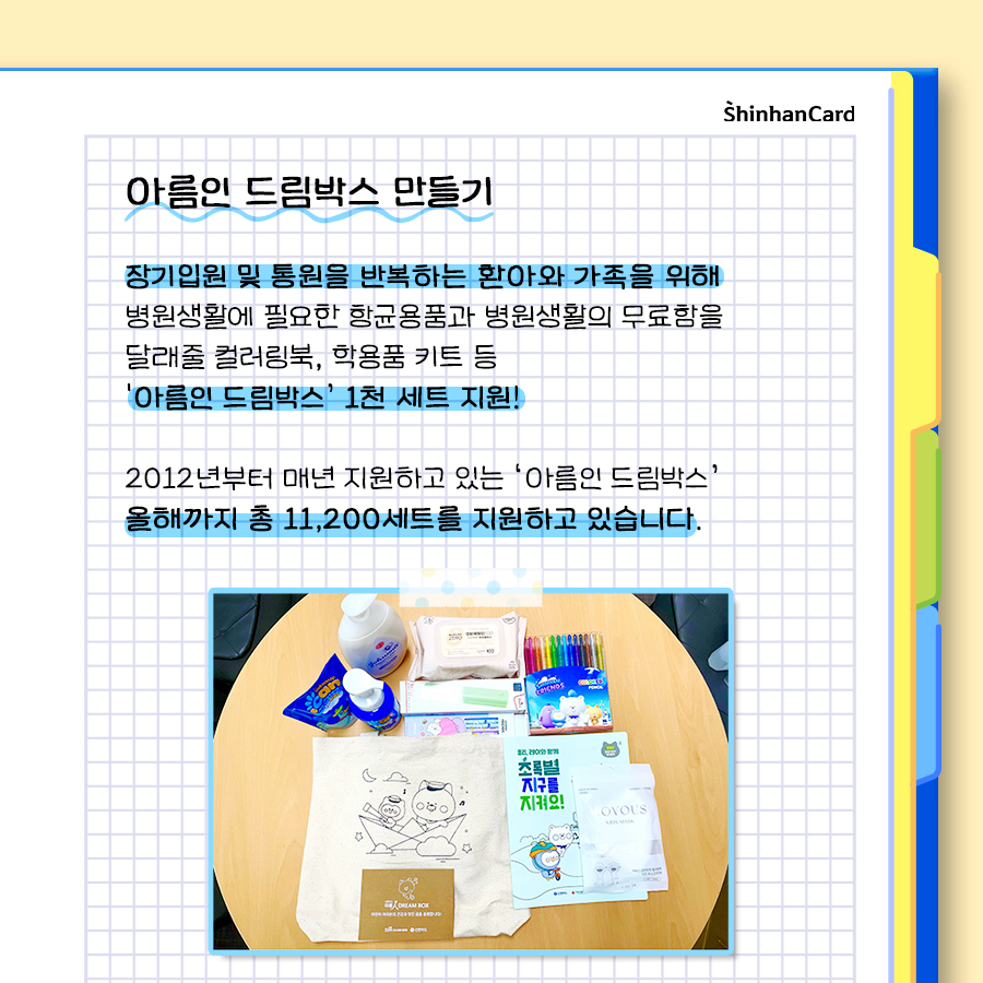 신한카드 임직원들은 더 나은 내일을 위해 한마음 한뜻으로 봉사활동에 동참했습니다. 먼저 난치질환 등으로 장기입원 및 통원을 반복하는 환아와 가족을 위해 아름인 드림박스를 제작했는데요. 아름인 드림박스는 병원생활에 필요한 향균용품과 병원의 무료함을 달래 줄 컬러링북, 그리고 학용품 키트로 구성되어 있습니다. 드림박스 제작은 지난 2012년부터 매년 지원하고 있는 봉사활동인데요. 올해도 임직원들이 참여해 1천세트를 지원했습니다.