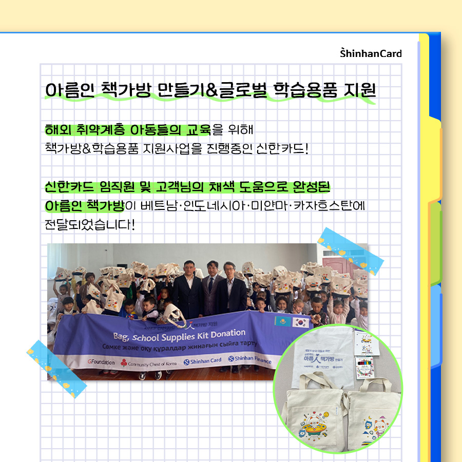 또 개발도상국 취약계층 아동들을 위한 봉사활동도 진행되었는데요. 바로 아름인 책가방 만들기! 책가방 도안에 채색을 해서 완성하고 완성된 가방에는 학용품세트를 넣어 꼭 필요한 개발도상국 아동들에게 전달했죠. 그 밖에도 기후위기 시대 도시의 중요한 사회적 인프라인 도시공원 가꾸기에도 참여하고 취약계층에 지원될 사랑의 빵을 직접 만드는 제빵 봉사활동까지 국내외 도움의 손길이 필요한 곳을 위한 사회공헌 활동을 아끼지 않았습니다.