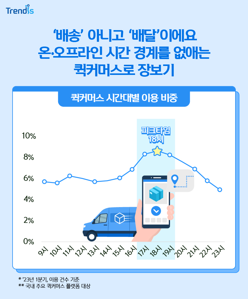 배달의 민족 B마트, 요기요 요마트 등의 주요 퀵커머스의 이용 시간대를 살펴보면 피크타임은 새벽도 야식시간도 아닌 저녁 18시로 나타납니다.