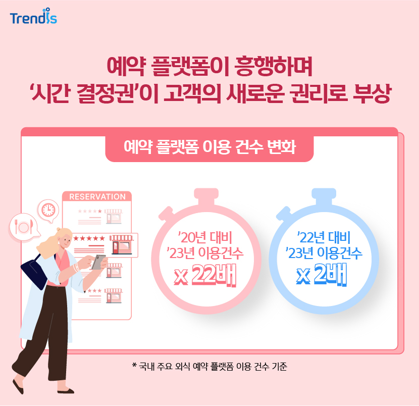 최근 3년간 ‘캐치테이블’같은 주요 음식점 예약 대행 서비스의 ’23년 1분기 이용 건수는 ’20년 동기대비 22배, ’22년 대비 2배나 성장 했습니다.