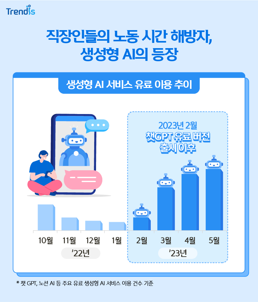 올 초 등장한 생성형AI, 챗GPT는 업무 생산성을 높여 고정적이던 ‘노동 시간’의 자유를 이루어낸 서비스 입니다.