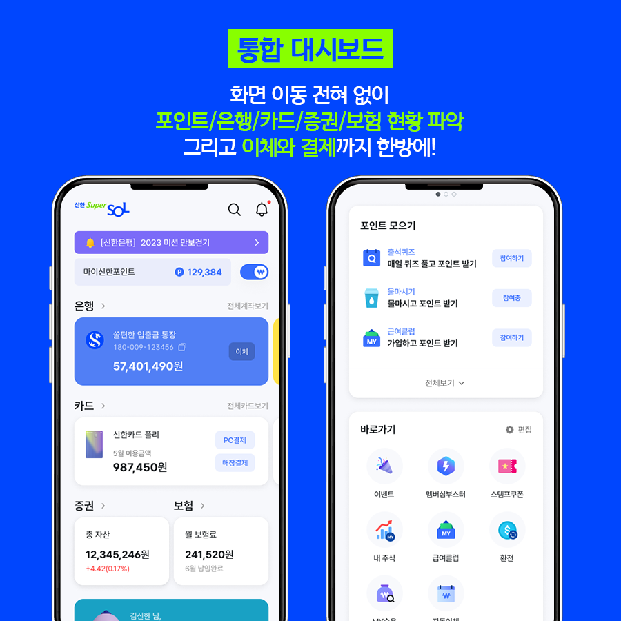 '금융을 새롭게, 신한이 한다’ 라는 슬로건과 함께 런칭한 신한 슈퍼SOL은 앱 하나에 신한금융그룹 은행/카드/증권/보험의 핵심 기능이 모두 탑재된 말 그대로의 슈퍼 앱인데요. 이제 앱 마다 이동할 필요 없이, 한 화면에서 계좌/카드실적/증권 현황 및 월 납입 보험료까지 확인 할 수 있게 되는 것이죠.