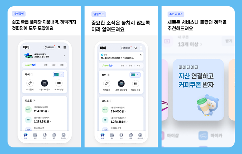 쉽게 사용할 수 있는 직관적인 UI는 물론이고, 은행/카드/증권/보험에 대한 정보와 기능을 검색할 수 있는 통합검색 기능, 모든 거래내역을 한번에 조회할 수 있는 통합알림 서비스 뿐 아니라 나의 혜택도 한 화면에서 깔끔하게 확인할 수 있습니다.