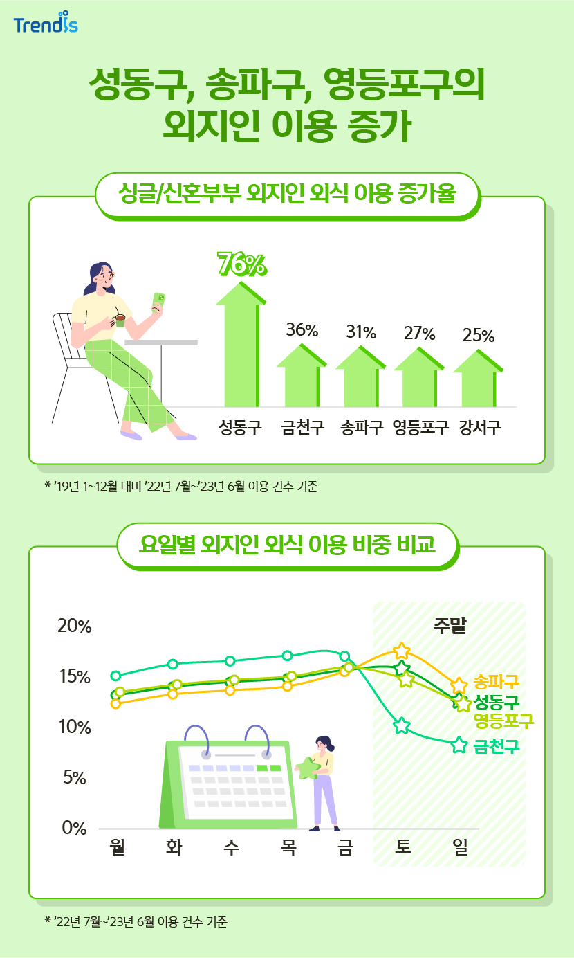 그럼 금천구를 제외한 외지인 외식 이용 증가율 TOP3 지역, 성동구/영등포구/송파구의 데이터를 좀 더 자세히 살펴볼까요.