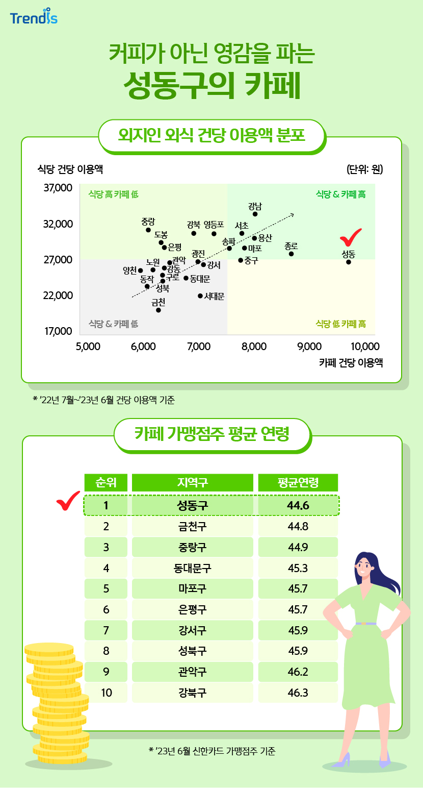 실제로 카페 가맹점주의 평균 연령을 살펴보면 서울에서 가장 낮게 나타나 젊은 크리에이터들이 성동구에 모여들고 있죠.