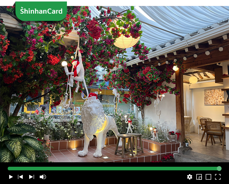 종로를 핫플로 이끈 익선동에서 크리스마스 숲에 들어와 있는 듯한 카페가 있습니다. 그동안의 크리스마스 이벤트 공간이 이국의 화려함으로 압도하는 느낌이었다면, 아삐뽀레의 크리스마스는 한옥 마당과 트리가 조화를 이루는 독특한 조화로 시선을 사로잡습니다. 채광이 잔뜩 들어오는 널찍한 공간, 탐스러운 붉은 꽃나무 아래에서 즐기는 티타임은 따뜻하고 설레는 기분이 듭니다.