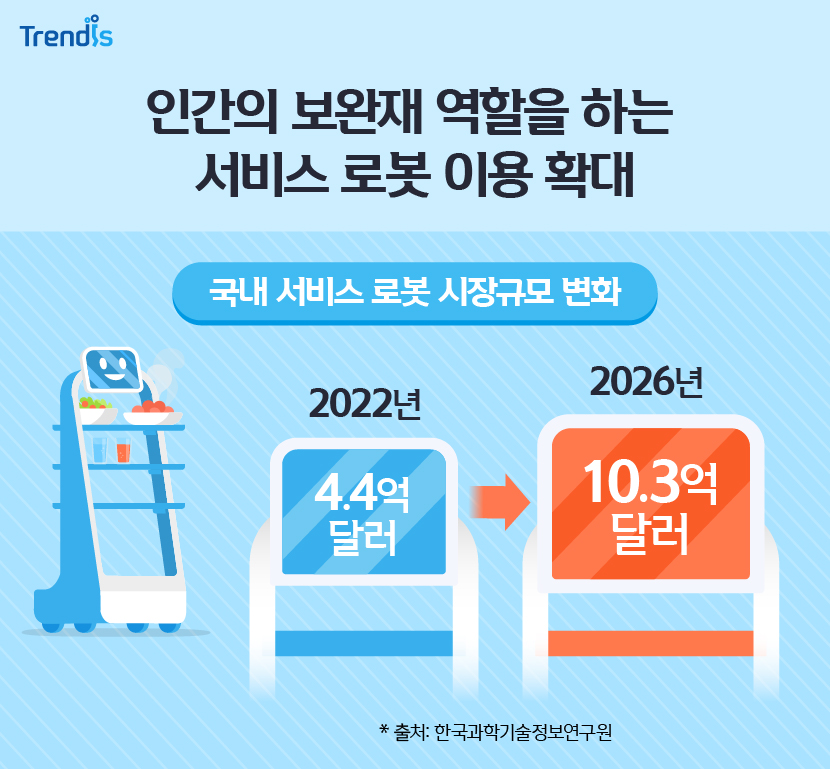 한국과학기술정보연구원은 국내 서비스 로봇 시장 규모를 2022년 4.4억 달러에서 2026년 10.3억 달러에 이를 것으로 예측하고 있습니다.