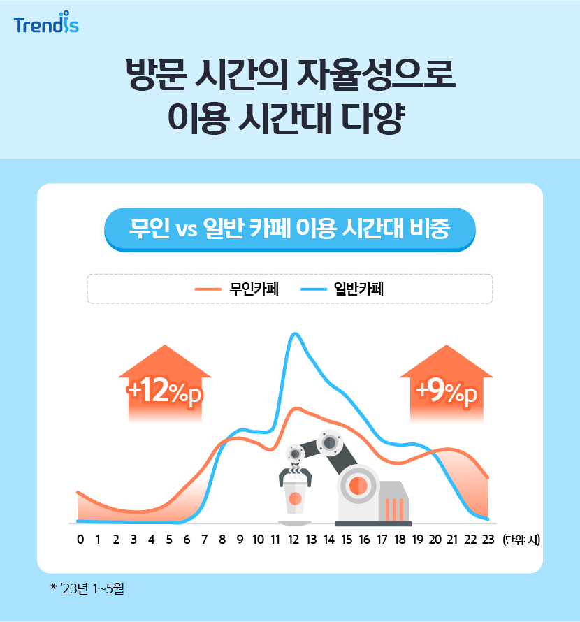 실제 무인 카페와 일반 카페의 이용 시간대를 살펴보면 일반 카페의 경우 점심시간 전후로 사용이 집중된 반면, 무인 카페는 늦은 저녁 및 새벽 시간대의 이용이 36%로 나타났습니다.