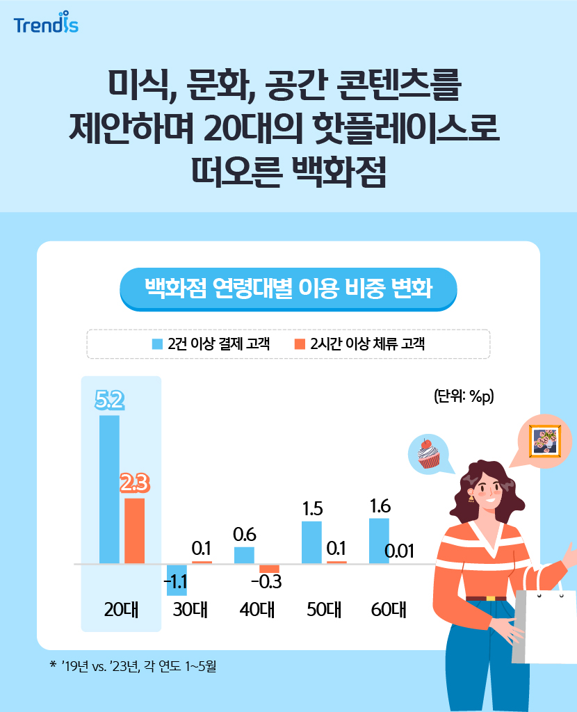 실제 백화점의 연령대별 이용을 살펴보면 4년 전 대비 20대의 결제 건수 및 체류 시간이 증가한 것을 확인할 수 있네요.