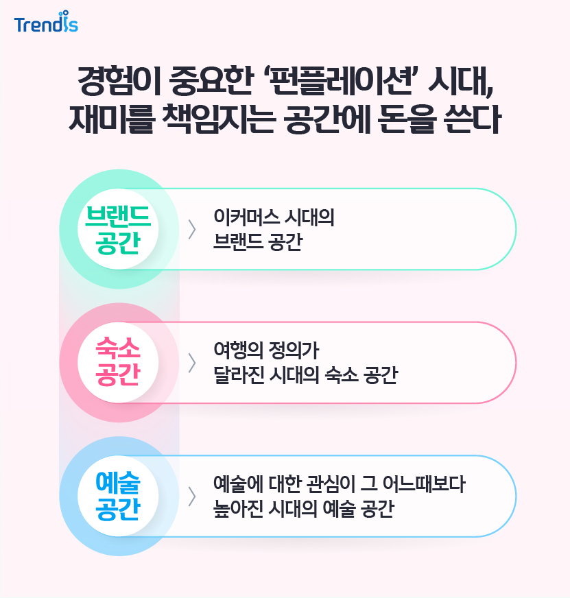 변화한 소비 맥락에 따른 ‘브랜드 공간’, 진화한 여행 패러다임에 맞춘 ‘숙소 공간’, 성숙해진 예술에 대한 관심을 반영한 ‘예술 공간’에는 어떤 특징이 있을까요?