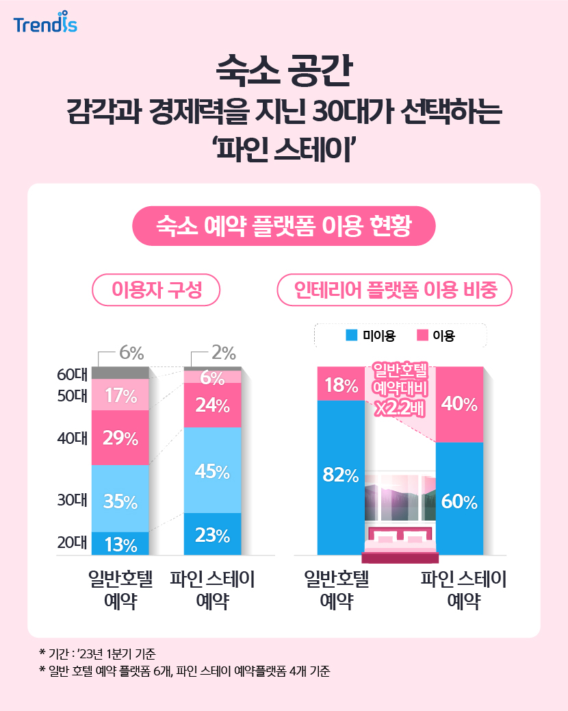 일반 호텔 예약 플랫폼보다 30대의 이용 비중이 높고, 파인 스테이 예약 플랫폼 이용자가 인테리어 쇼핑 플랫폼을 약 2.2배 더 많이 이용하고 있습니다.