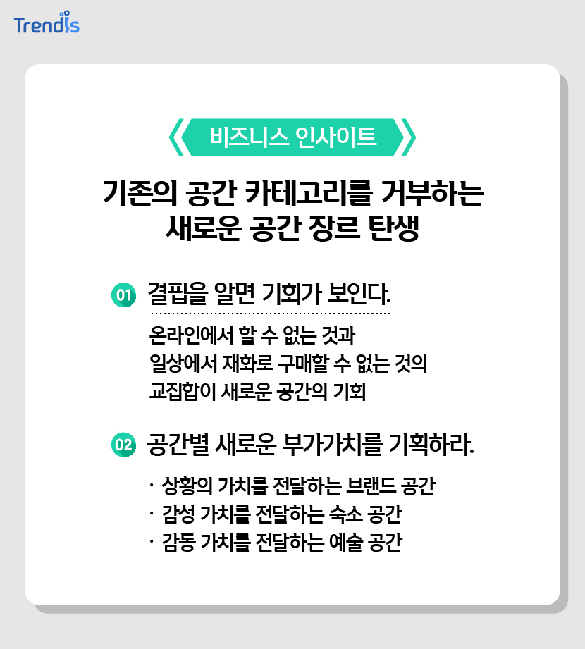 이번 카드 뉴스는 사람들이 주목하는 새로운 공간 장르를 살펴보도록 하겠습니다.