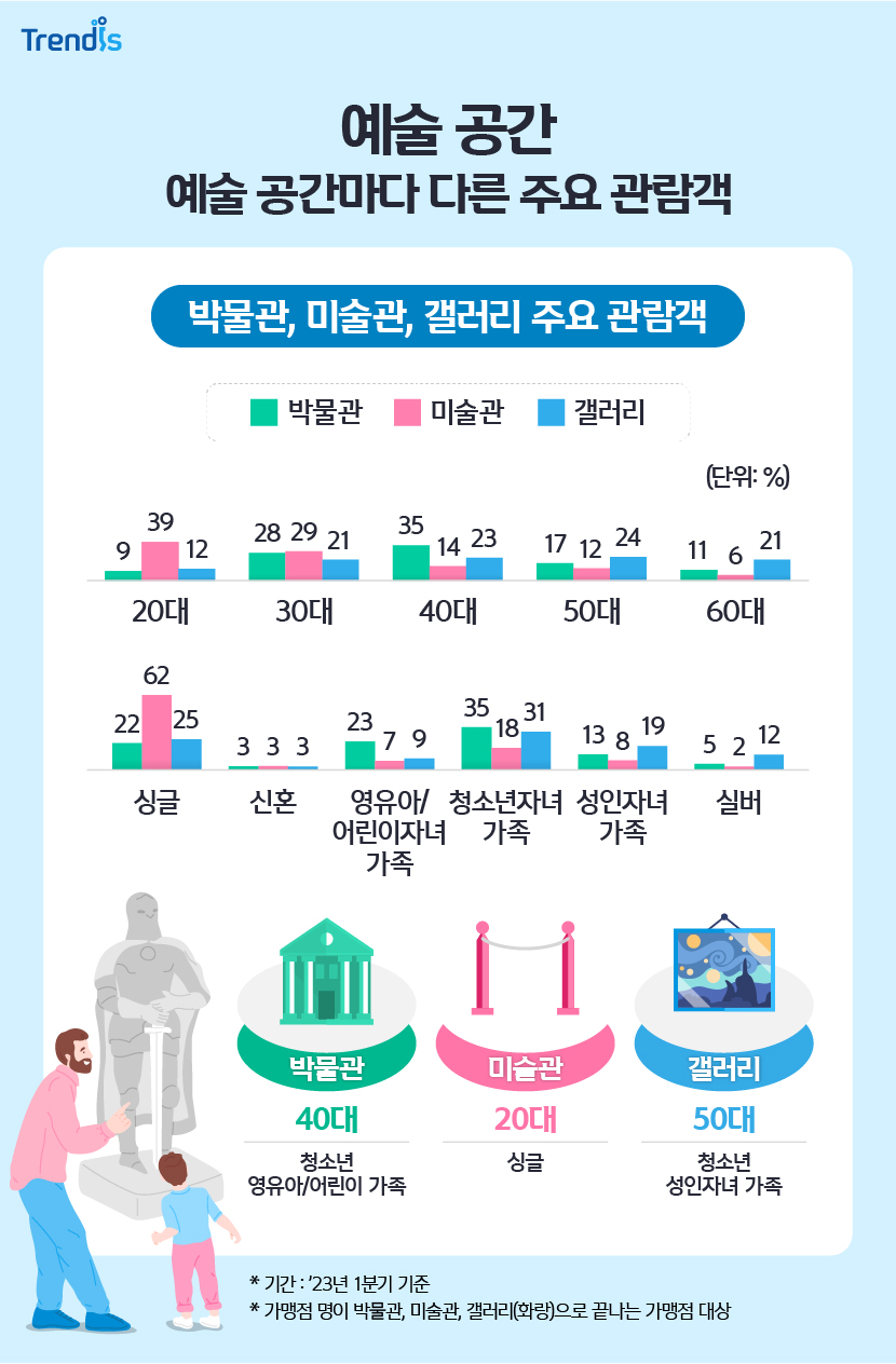 박물관은 주 결제자가 40대인 가족 위주 관람객이 많고요, 미술관은 20대 싱글, 갤러리는 청소년, 성인 자녀를 둔 50대가 주로 이용하고 있네요!