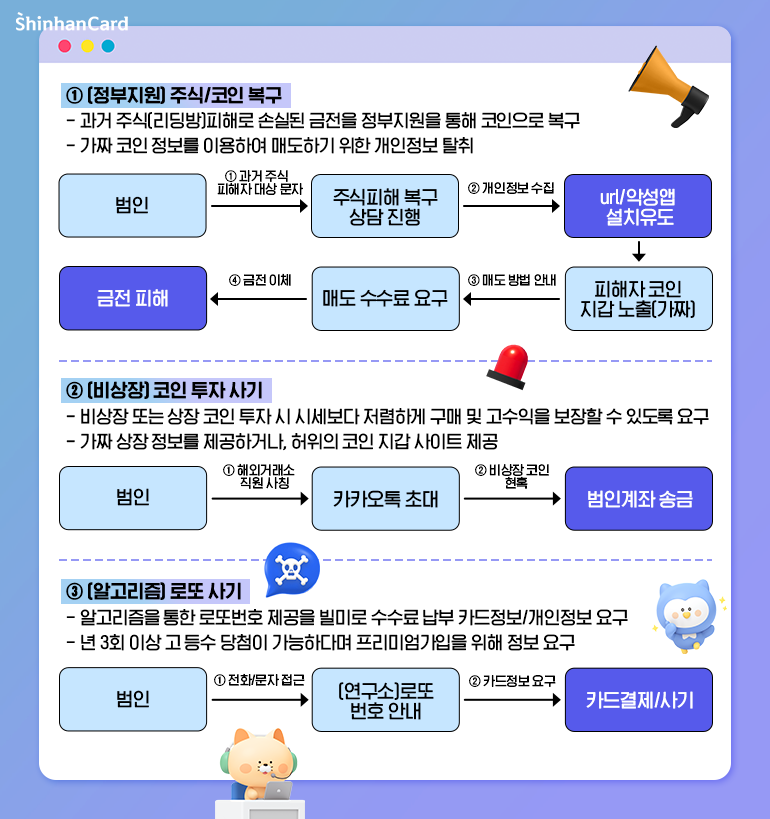 기존 다양한 피싱 유형에 더불어 사회문제와 밀접한 관련이 있는 신종 사기 수법들도 많이 생겨나고 있습니다. 코로나19 시기, 유행처럼 번졌던 주식이나 코인투자와 관련된 사기 수법이 그 예인데요. 과거 주식 피해로 손실된 금전을 정부 지원으로 복구해준다며 유인 후 가짜 코인 정보를 이용해 개인정보를 탈취, 가짜 코인을 매도해야 한다며 수수료로 금전을 요구하는 방식입니다. 또 비상장 또는 상장 코인 투자 시 시세보다 저렴하게 구매 가능하다고 하거나 고수익을 보장한다는 내용으로 유도해 가짜 상장 정보나 허위 코인 지갑 사이트 등을 제공해 금전 피해를 유발하는 코인 투자 사기도 발생하고 있습니다. 여기에 알고리즘을 통한 로또 복권 번호 제공을 빌미로 수수료 납부를 위한 카드정보/개인정보 등의 탈취를 유도하는 로또 사기까지! 신종 피싱의 수법은 점점 교묘하게 진화하고 다양화되고 있습니다. 새롭게 떠오르고 있는 신종 사기 유형은 어떤 방식으로 진행되고 있는지 알아보겠습니다.