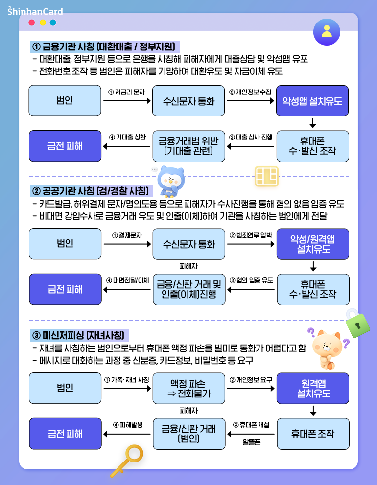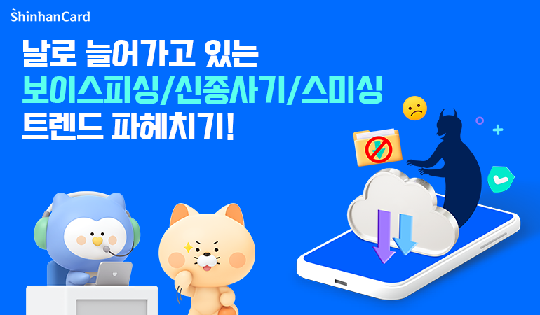 날이 갈수록 더 교묘해지고 있는 보이스피싱! 신종 보이스피싱 수법으로 인한 피해 고객들과 그 피해 규모가 급격하게 늘어가고 있습니다. 보이스피싱에 대한 정보를 알고 있어도 막상 내 일이 되면 이를 피하기란 쉽지 않은데요. 그래서 보이스피싱 피해 고객 대부분의 이야기를 들어보면 피싱 수법을 어느 정도 알고는 있지만 정확한 예방법과 대처법은 잘 몰라서 피해를 입은 경우가 많습니다. 그래서 신한카드가 준비했습니다. 새롭게 등장한 보이스피싱 유형과 트렌드, 예방법까지 하나하나 모두 파헤쳐 볼게요! 모두 꼭 정독해주세요!