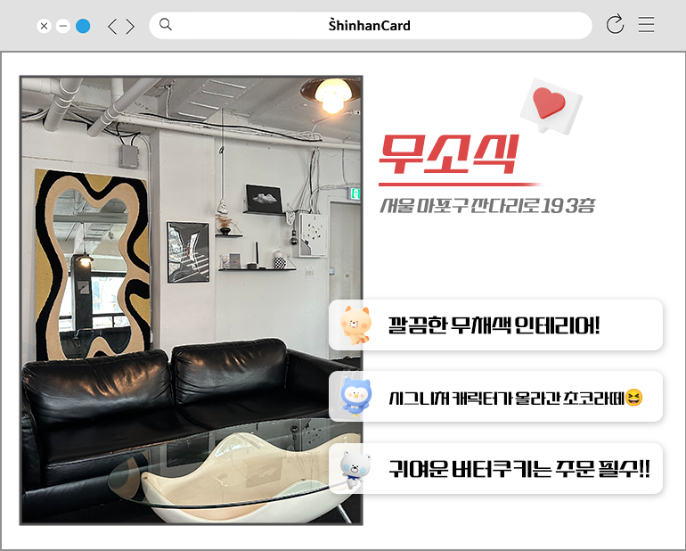 상수동에 위치한 카페 무소식은 전체적으로 블랙화이트의 인테리어를 고수하는 멋스러운 공간입니다. 하지만 딱딱하거나 무겁게 느껴지지는 않는데요, 귀여운 시그니처 캐릭터를 활용한 버터 쿠키와 뜻밖의 깜찍함을 품은 라떼 아트를 보신다면 저항 없이 웃어버리게 된답니다! 뽀얀 밀크폼위에 무심하게 톡톡 그린 듯한 귀여운 강아지 캐릭터 아트는 귀여운 건 못 참는 분들을 유혹하는 치트키인데요. 여기에 눈을 부릅 뜬 매력적인 곰돌이 쿠기까지 더하면 완벽하게 귀여운 디저트 한 상, 완성!