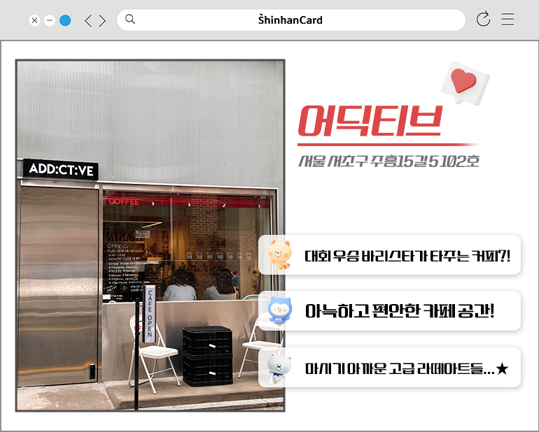 또한 아늑한 매장 공간은 동네 단골분들이 많이 찾아 주시는 핫플로, 초면이라도 편안함을 느끼며 선뜻 방문할 수 있는 곳입니다. 어딕티브에 방문한다면 쫀쫀한 밀크폼 위에 해마, 유니콘 등 유니크한 고급 라떼아트 기술이 더해진 말차라떼, 카페라떼를 추천드려요. 특별히 블렌딩된 우유 베이스에 얼음 없이 제공되는, 베일에 싸인 꿀꺽(?)라떼도 이곳만의 시그니처 메뉴이니 꼭 주문해 보시기 바랍니다. 오랜 시간 커피에 진심을 쏟고 있는 사장님의 애정을 느끼면서 마시는 라떼는, 평소 내 손에 쥐어지는 커피잔보다 확실히 특별하고 근사한 기분을 안겨줄 거예요.