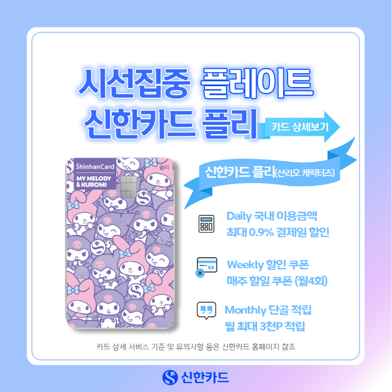 자 오늘의 신한카드 혜택별 카드 총정리 마지막 카드는 바로 바로 산리오 덕후들을 위한 귀요미 카드! 신한카드 플리에요! 사실 이 카드는 귀여움 가득한 산리오 친구들이 들어가 있다 보니 누구나 갖고 싶어 할 만한 카드로, 출시하자마자 엄청난 인기를 끌었는데요.