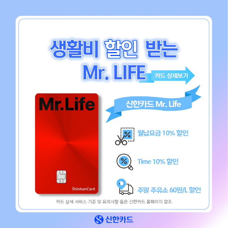 먼저 생활비 할인받는 Mr.Life 카드를 소개합니다! 이 카드는 신한카드 중에서 생활비 혜택이 가득한 카드 중 하나인데요. 지난해 인상된 전기세와 가스비로 무섭게 치솟는 아파트 관리비 때문에 걱정 많으시죠? 그런 분들에게 찰떡으로 딱 맞는 카드! Mr.Life 카드입니다.