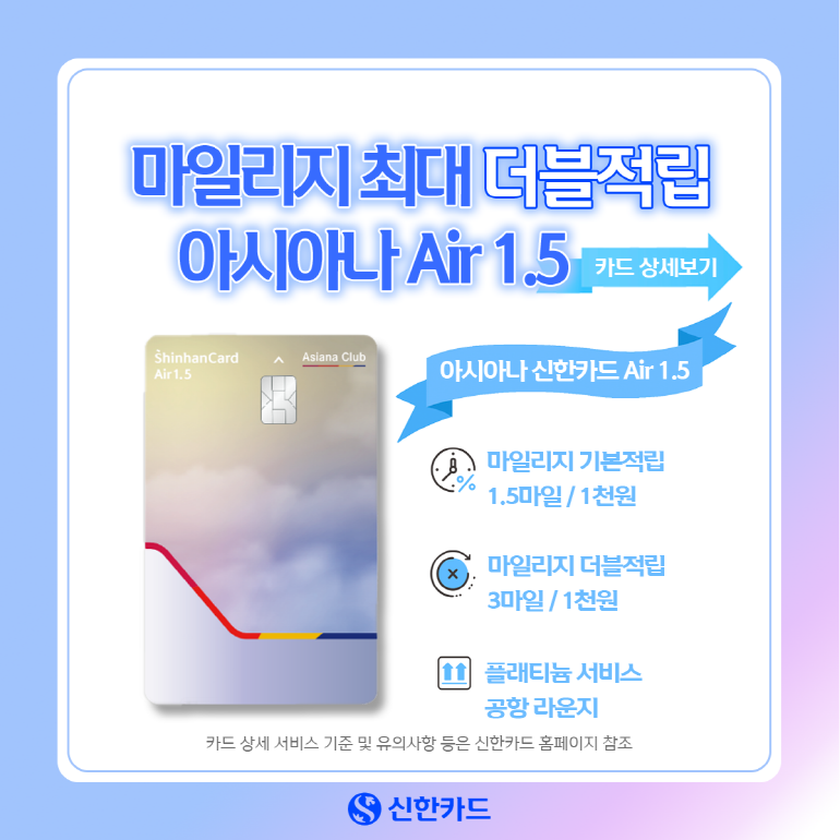 이 카드는 마일리지를 최대 더블 적립 가능한 아시아나 신한카드 Air 1.5 카드에요! 올해 해외여행 계획은 다들 어떻게 세우셨나요? 여행을 좋아하시는 분들이나 출장이 잦으신 분들에게 딱 맞는 마일리지 카드로 여행 준비하시는 건 어떨까요?