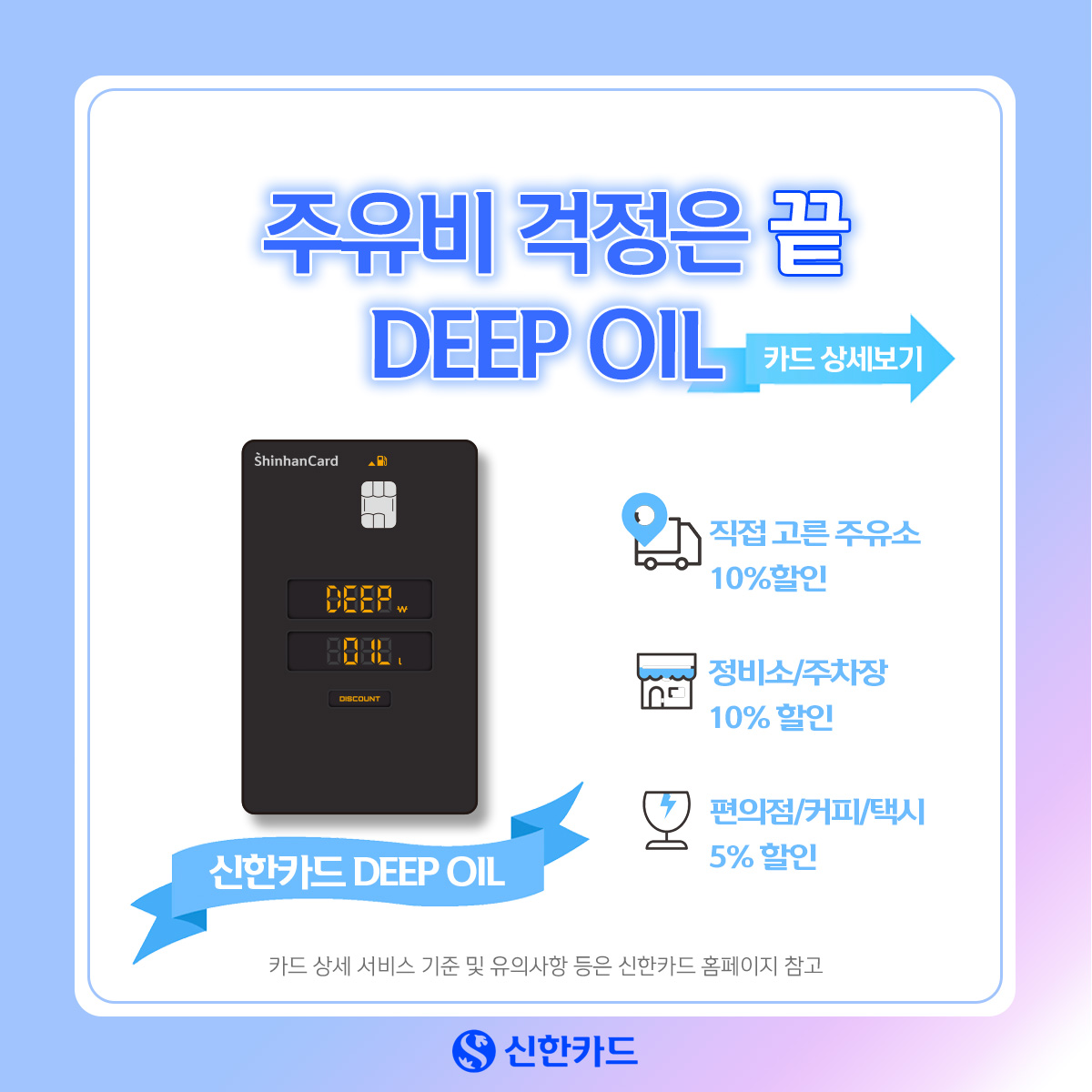 그 다음으로 소개해 드릴 카드는 차량이동을 많이 하시는 분들을 위한 주유비 걱정 없는 Deep Oil 카드인데요!