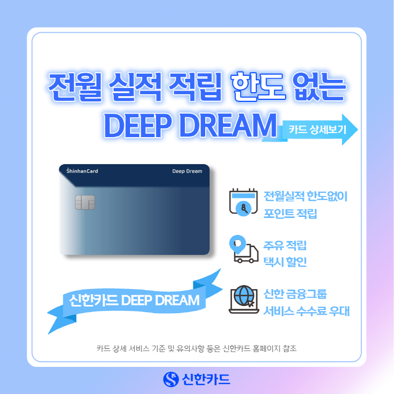 그 다음으로 보여 드릴 카드는 바로 Deep Dream 카드인데요. 앞서 소개해 드린 생활비나 주유비, 여행비 뿐만 아니라 어느 하나에 특정되지 않고 다양한 소비 항목에 속하시는 분들에게! 또한, 여러 가지 혜택 비교가 어려우신 분들에게! 국내/해외 가맹점 적립이 가능한 딥드림 카드를 추천합니다.