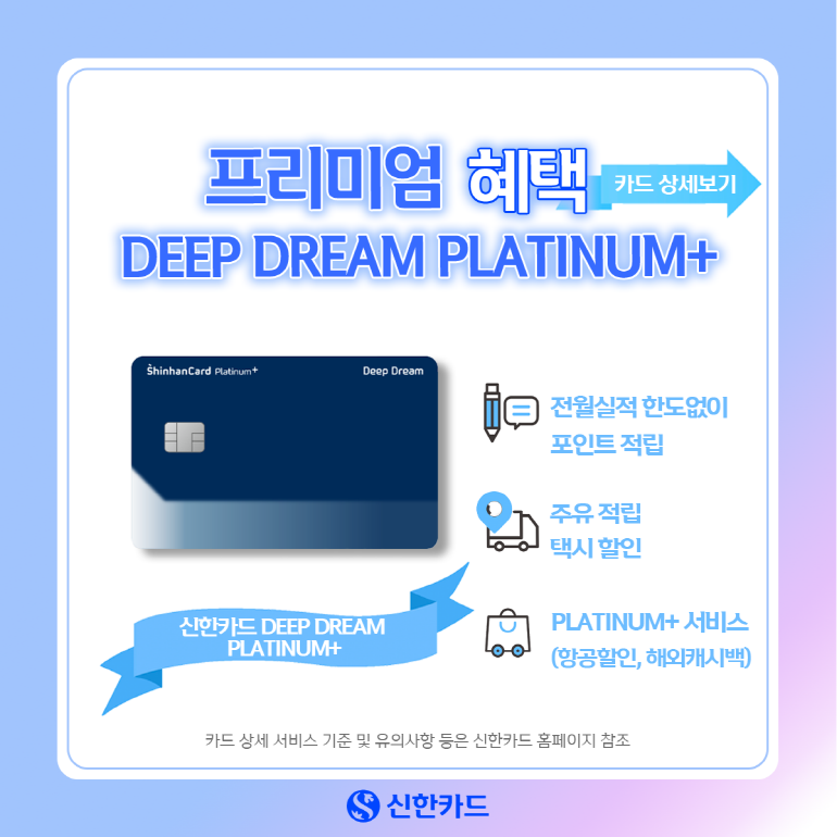 그리고 앞서 말씀드린 Deep Dream 카드의 플래티넘 버전! 딥드림 카드와 같이 전월 실적, 적립 한도 없이 포인트 적립이 가능하지만 전월 이용 금액이 150만원 이상일 경우에 적립률이 최대 5.5%까지 적립이 되는 카드에요!